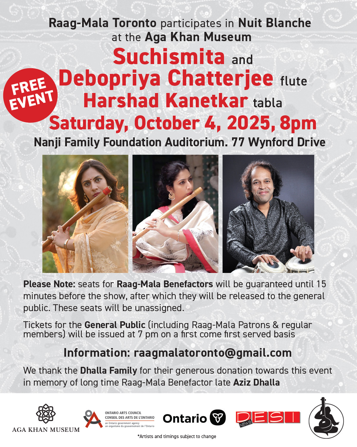 Aga Khan Museum 77 Wynford Dr,, North York, Ontario, CanadaRaag-Mala Toronto participates in Nuit Blanche at the Aga Khan Museum Saturday October 4th 2025 at 8pm Suchismita and Debopriya Chatterjee (Flute) with Harshad Kanetkar on Tabla. In a tradition