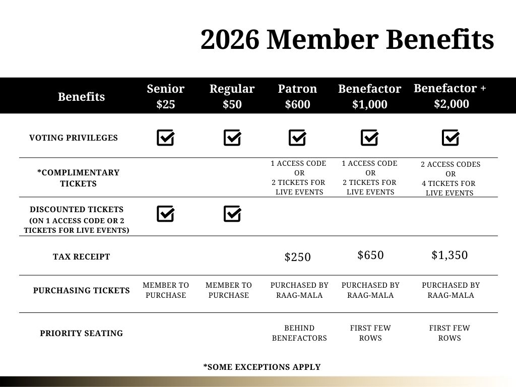By becoming a Raag-Mala Toronto member, you not only get the benefits of each membership tier, but you also get to become a part of the Raag-Mala community. Memberships support up to 50% of Raag-Mala’s funding model, so you also help to support the organization and Indian Classical Music in North America.